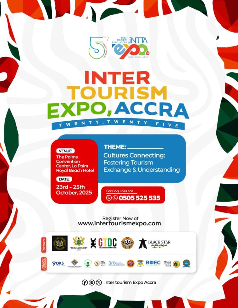 Ghana is poised to welcome the world once again as it prepares to host the 5th edition of the Inter Tourism Expo Accra (iNTTA 2025), scheduled for October 23rd to 25th, 2025, at the Palms Convention Centre, La Palm Royal Beach Hotel, Accra. Organized in collaboration with the Ghana Tourism Development Company (GTDC) and under the auspices of the Ministry of Tourism, Culture and Creative Arts, this year’s Expo promises to be a landmark event in the region’s tourism calendar.